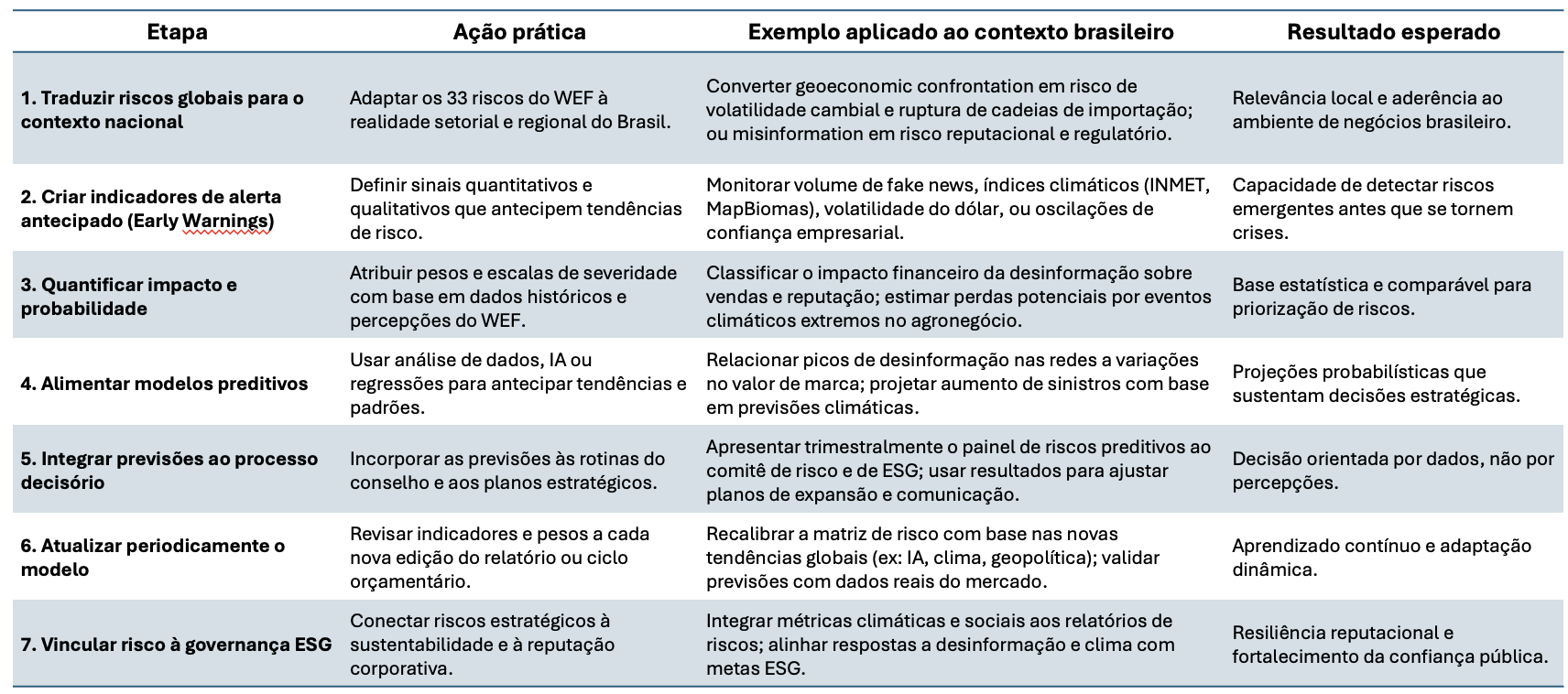 Em termos metodológicos, o relatório também oferece uma lição de governança: a importância da atualização constante. O ambiente de risco global muda rapidamente, e revisões anuais de matriz, alinhadas às novas edições do Global Risks Report, ajudam a manter as empresas conectadas às tendências emergentes. Mais do que um exercício de compliance, trata-se de um processo de aprendizado institucional, em que cada ciclo de revisão aprimora a capacidade de antecipação e resposta.