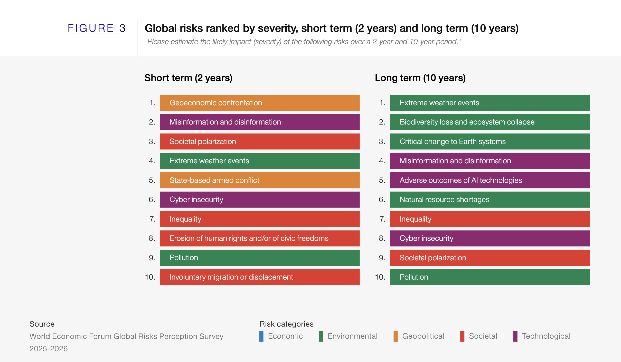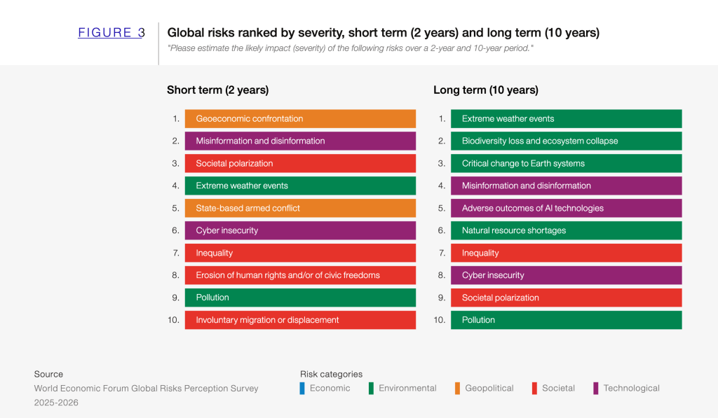 No curto prazo, o relatório aponta dois riscos que merecem atenção imediata: desinformação e confronto geoeconômico. A combinação entre tecnologia avançada, populismo e competição entre grandes potências cria um terreno fértil para crises reputacionais e para distorções no ambiente regulatório. No longo prazo, os riscos se deslocam para o campo ambiental: eventos climáticos extremos, colapso de ecossistemas e mudanças profundas nos sistemas da Terra aparecem entre as principais ameaças à estabilidade global até 2036.